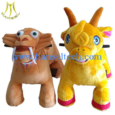 Hansel plush animal scooter are battery operated with coin or non coin type animals,it can walking in outdoor and indoor playground,we use fireproof plush with cotton inside for the animal skin,and structure material inside is mental steel frame which is very strong to bear a weight of 130kg.with its attractive appearance to consumers and fast profits to operator,more and more people are join this business,Will you join this business?